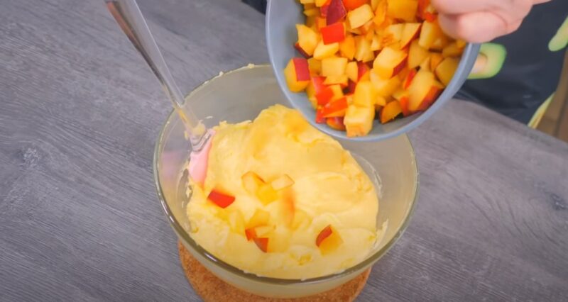 Нарезаем маленькими кусочками нектарин, кладем в крем, смешиваем.