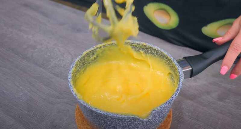 Постепенно выливаем оставшиеся части молока в смесь. На среднем огне доводим молоко до загустения, постоянно помешиваем венчиком. Накрываем основу для крема в контакт с пищевой пленкой, оставляем остывать.
