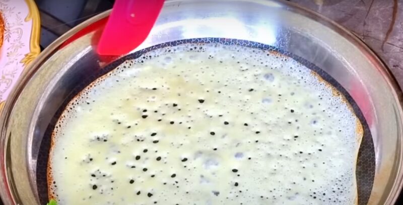 Замешиваем тесто для блинов, постепенно вливая оставшуюся часть молока. В тесто интегрируем крутой кипяток, смешиваем жидкости. Выливаем затем растительное масло, тщательно перемешиваем компоненты.