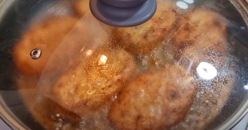 Далее закрываем котлеты крышкой, тушим на умеренном огне 10 минут.