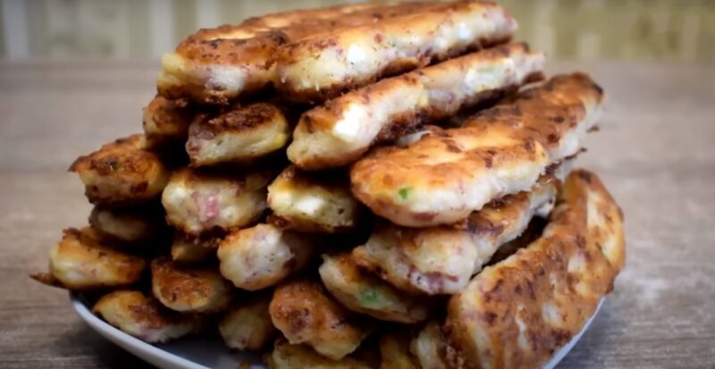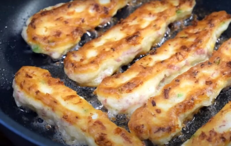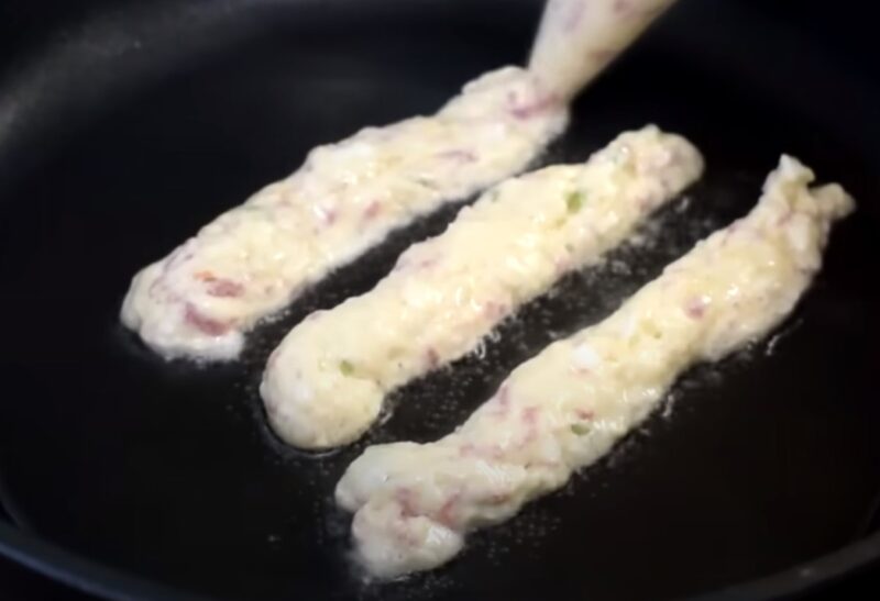 Получившуюся массу перекладываем в кондитерский пакет, смазанный растительным маслом. Выдавливаем содержимое на сковороду в форме колбасок.