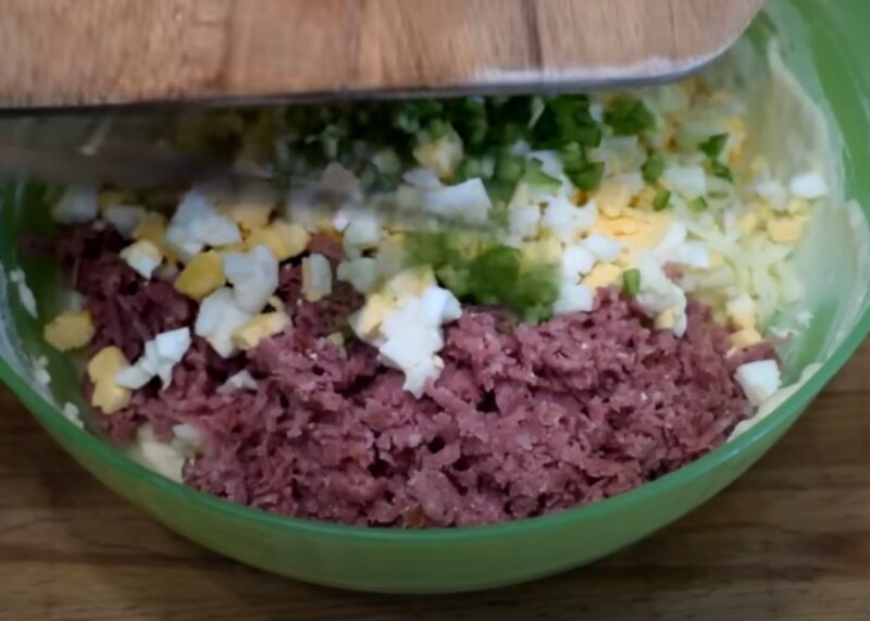 На крупной терке натираем сыр и копченую колбасу. Отправляем в тесто. Куриные яйца отвариваем и мелко нарезаем. Соединяем с остальными ингредиентами. Добавляем зелень или небольшой острый перчик.