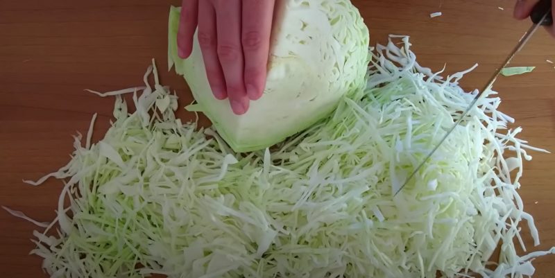 Для начала берем кочан капусты и мелко нарезаем. Шинкуем мелко, чтобы капуста быстрее приготовилась, так как большие кусочки будут мариноваться дольше.