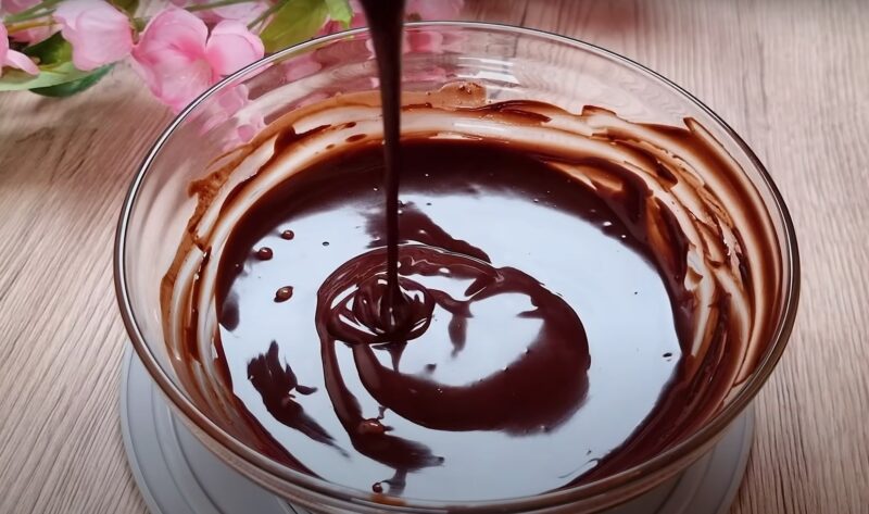 Выливаем шоколад в кондитерский мешок. После выпекания украшаем шоколадом десерт.
