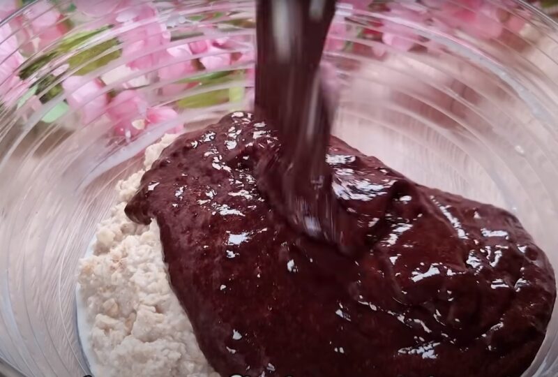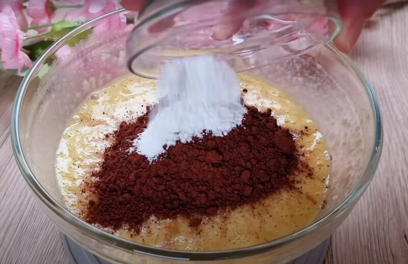 К банановому пюре разбиваем яйца, солим и перемешиваем. Просеиваем в банановую массу какао порошок и разрыхлитель, смешиваем.