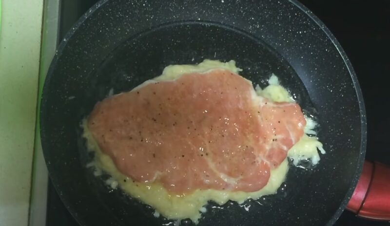 Заворачиваем стейки свинины в пищевую пленку и хорошо отбиваем с обеих сторон. Посыпаем стейки солью и любимыми специями, выдавливаем через пресс чеснок на стейки.