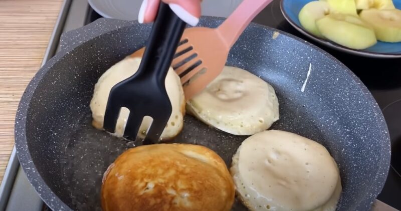Выкладываем яблоки в тесте на сковороду, обжариваем с обеих сторон до золотистой корочки.