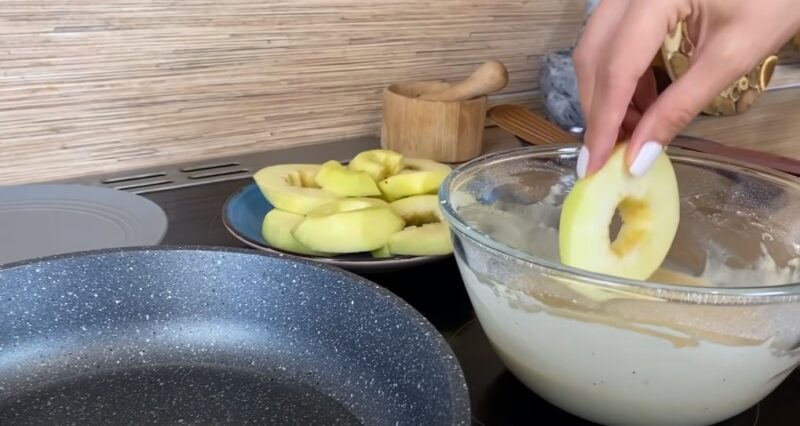 Очищаем яблоки от кожуры и семенных коробочек. Яблоки нарезаем кольцами толщиной см. В сковороде разогреваем растительное масло, обмакиваем каждое колечко яблока в тесте.