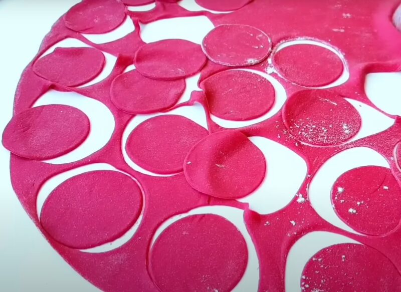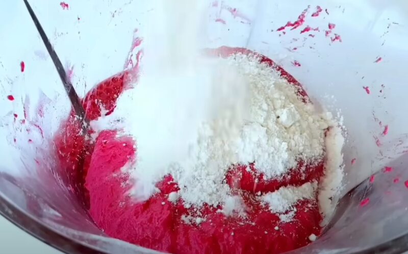 Разбиваем к соку яйцо, высыпаем соль и перемешиваем. Высыпаем в смесь муку частями, замешиваем розовое тесто. Оставляем тесто под целлофаном на 5 минут.