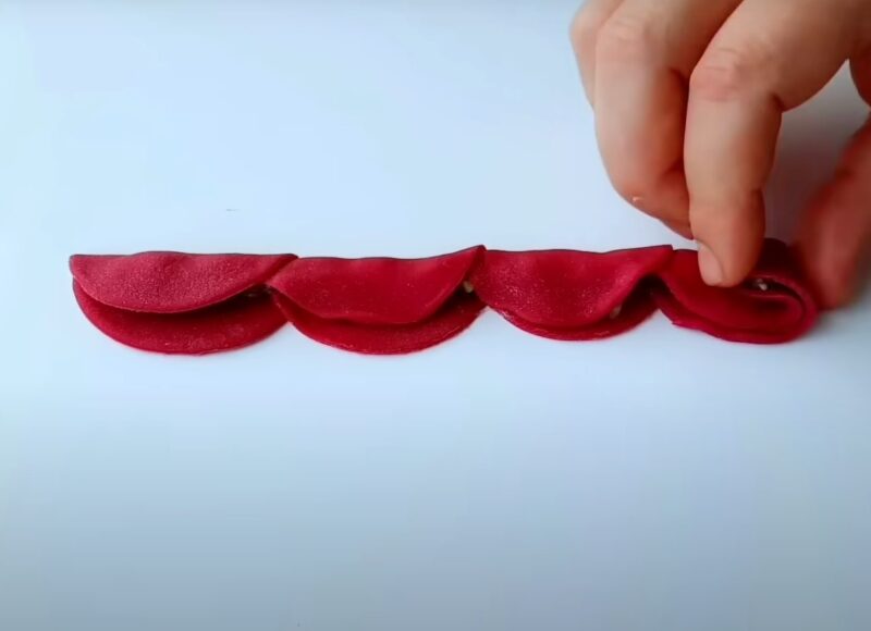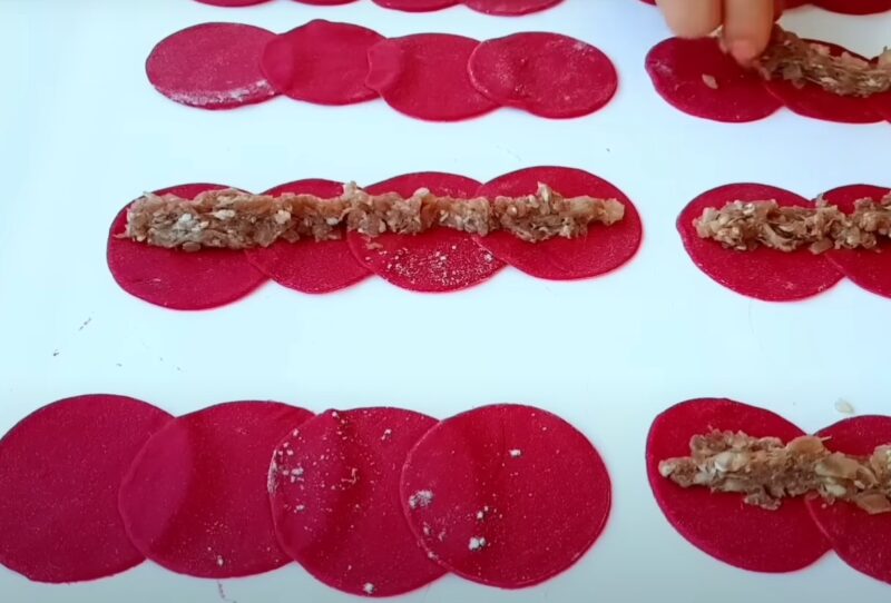 Складываем каждые 4 круга слегка внахлест друг на друга. По длине полученных кругов выкладываем полоску из фарша.