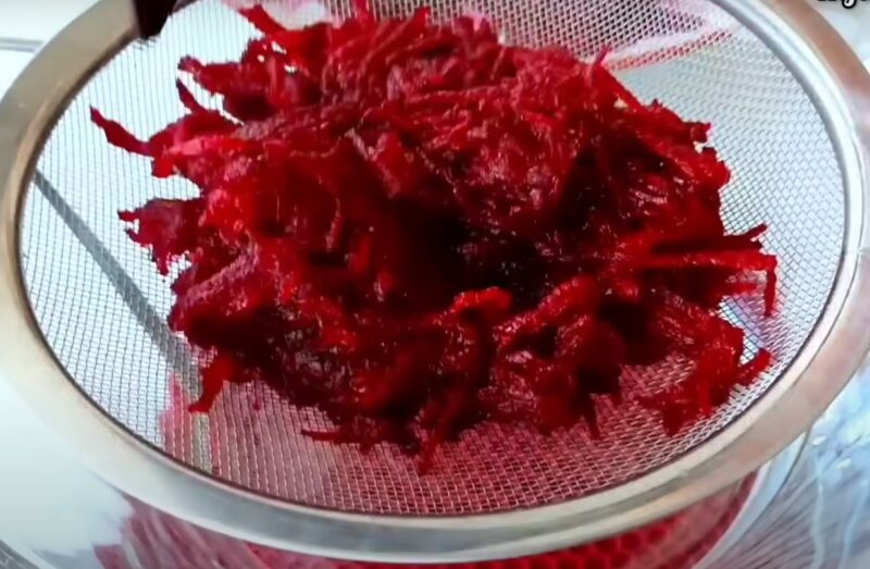 Очищенную свеклу натираем на мелкой терке, солим и оставляем на 15 минут. Выливаем сок свеклы при помощи шумовки в отдельную емкость.