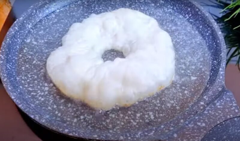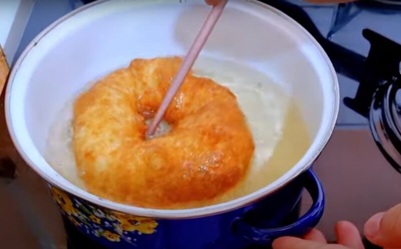 Затем отправляем пончик готовиться в кастрюле, залитой растительным маслом, на сильном огне.