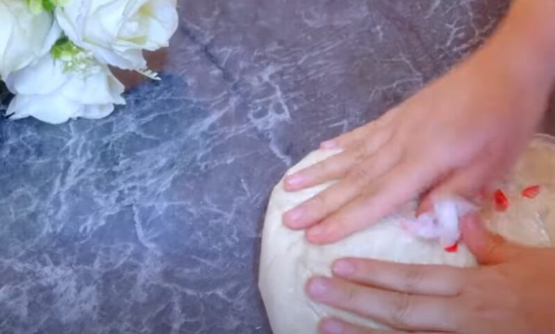 Перемешиваем ингредиенты и добавляем 250 грамм муки. Завязываем пакет и перемешиваем мнущими движениями.