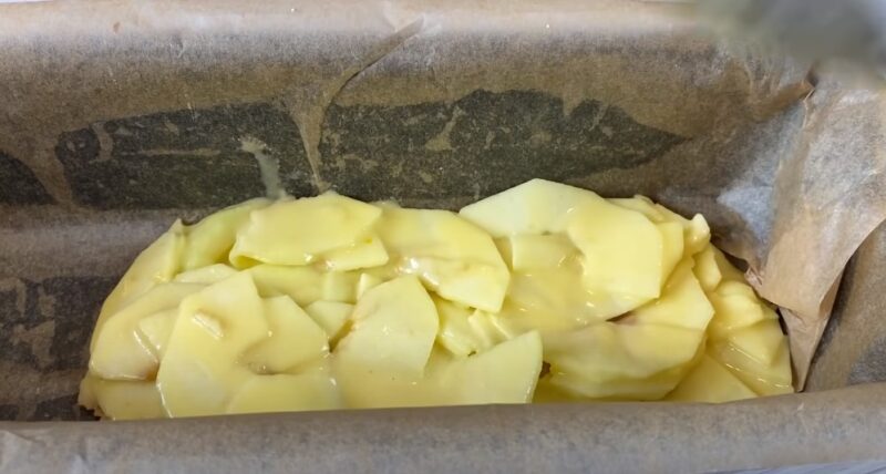 Выкладываем яблочные дольки в тесте в форму, равномерно распределяем по дну.