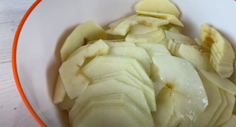 Очищаем яблоки от кожуры и сердцевины, нарезаем тонкими дольками. Сбрызгиваем яблочные дольки лимонным соком, чтобы мякоть не потемнела.