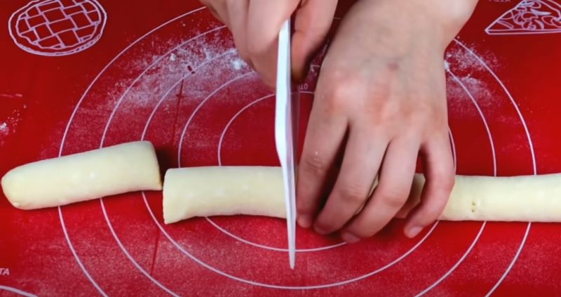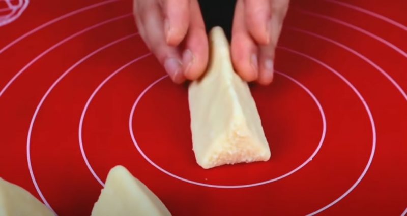 Режем порционными кусочками, длиной около 5 см и придаем ей форму треугольника.