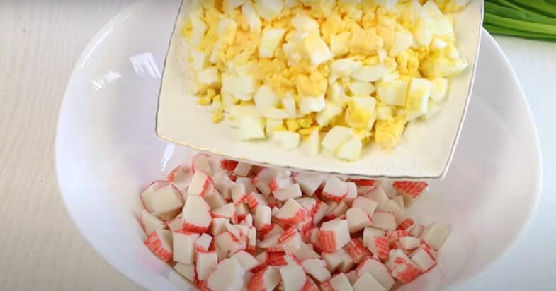 Крабовые палочки и вареные яйца нарезаю кубиками, кладу в глубокую миску.