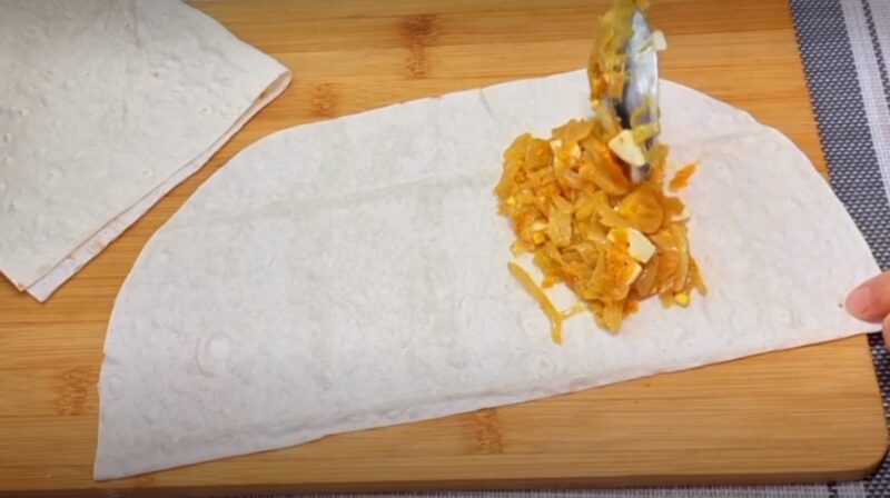 Берем лаваш, складываем пополам и разрезаем. Из одного пласта мы получаем два пирожка. На одну из сторон лаваша кладем небольшое количество начинки, достаточно двух столовых ложек.