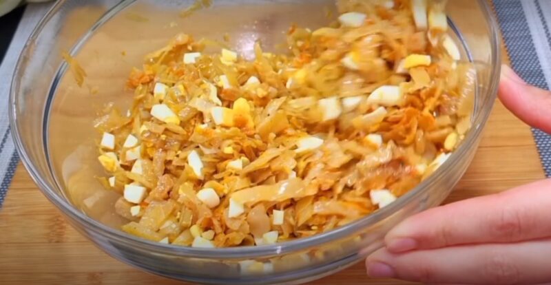 Отвариваем три куриных яйца, нарезаем кубиком. Соединяем с остывшей жареной капустой.